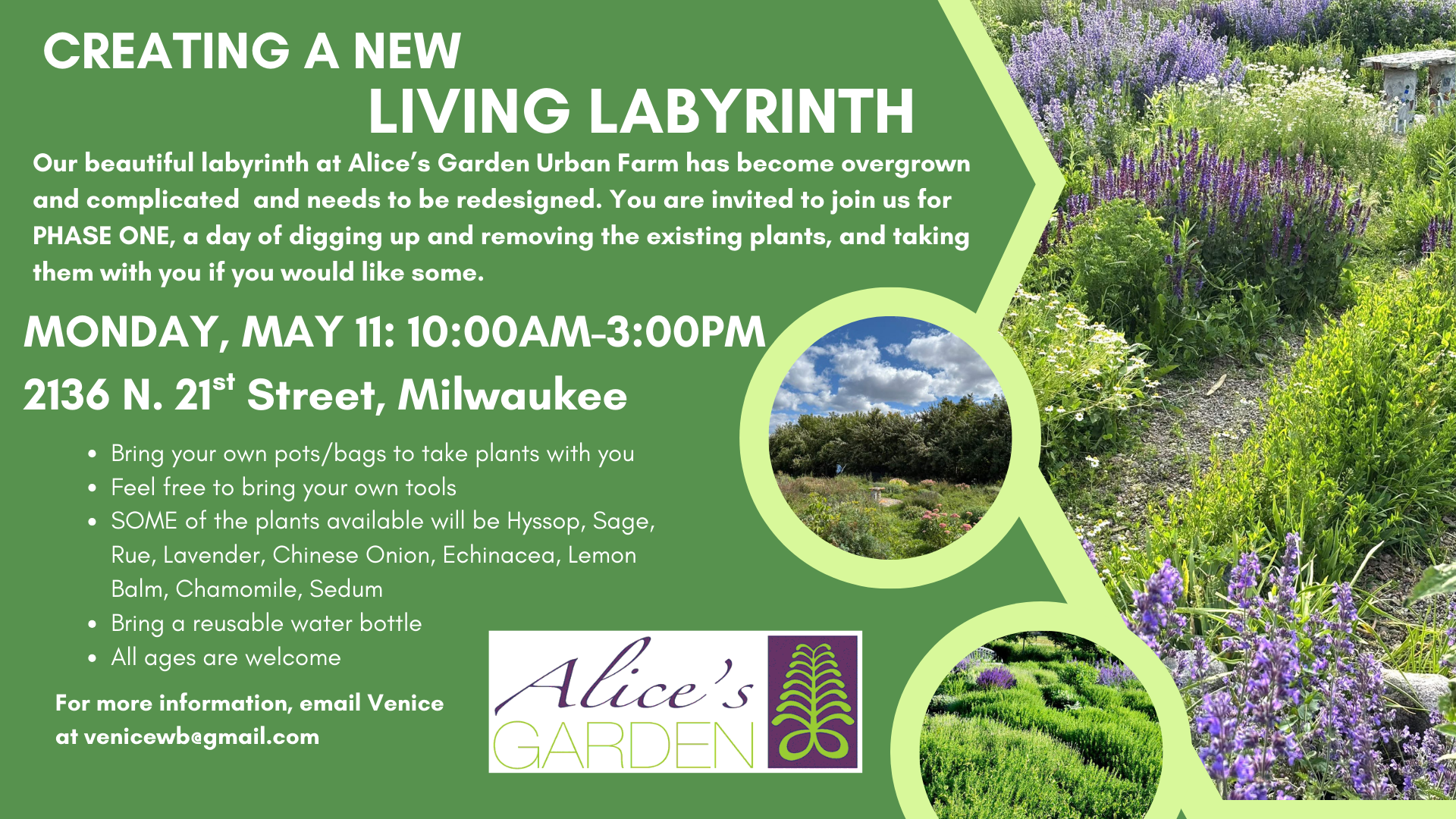The labyrinth is an invitation to walk with openness to the moving of the Spirit of Life (whoever/whatever we place our ultimate trust). The path, marked with healing herbs & plants, leads to the center and out again. To walk the labyrinth is to step away from our every day life for a moment, to slow down, to ponder, to listen, to receive guidance, healing, inspiration… Through walking, connection is realized in ones deeper self, in community and in the universe. Individuals or groups are welcome.